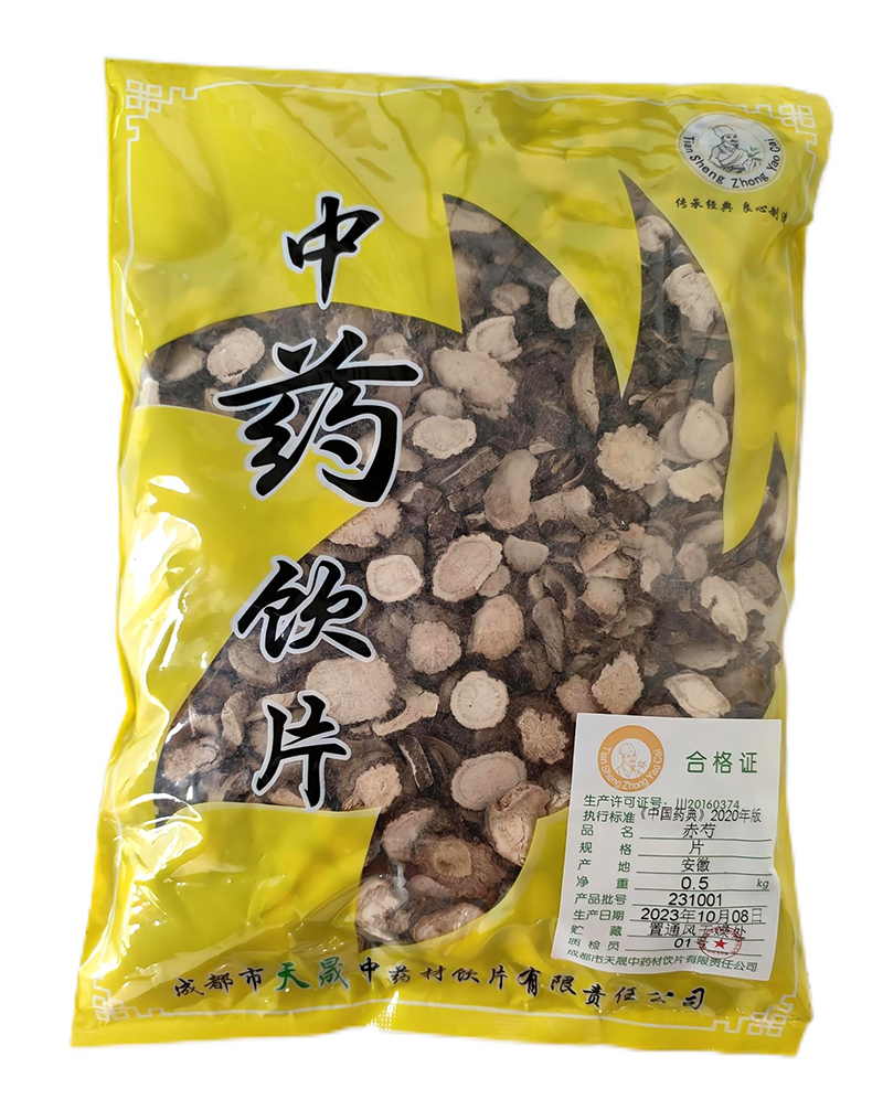 本品为类圆形切片,外表皮棕褐色。切面粉白色或粉红色,皮部窄,木部放射状纹理明显,有的有裂隙。